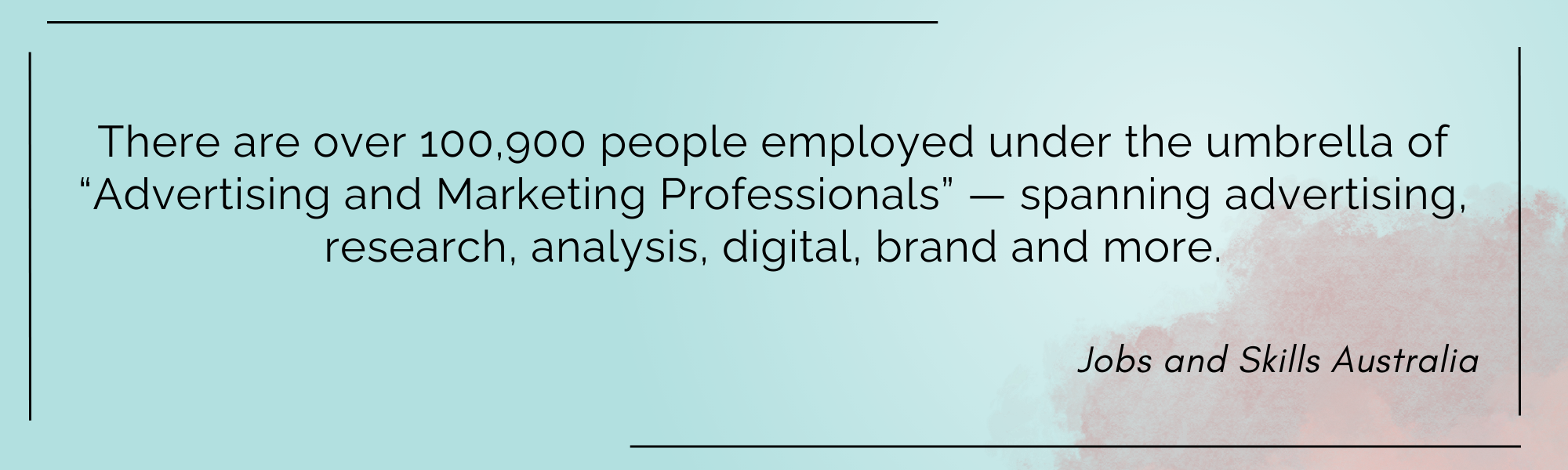 According to Jobs and Skills Australia, there are over 100,900 people employed under “Advertising and Marketing Professionals” — spanning advertising, research, digital, brand and more.